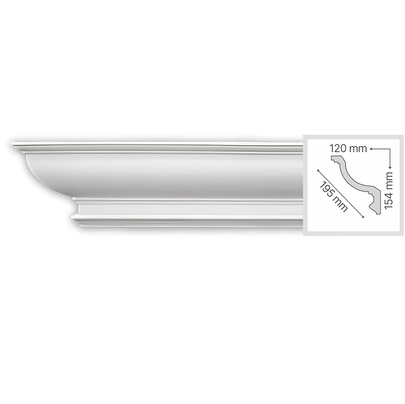 Ez a nagy méretű poliuretán holker díszléc ideális választás mind kül-, mind beltéri dekorációhoz, ahol a hangsúlyos megjelenés és a tartósság kiemelten fontos. A 154 mm-es magasság és a 120 mm-es kiállás impozáns, karakteres formát eredményez, amely látványosan keretezi a fal és mennyezet találkozását, elegáns megjelenést kölcsönözve a térnek.