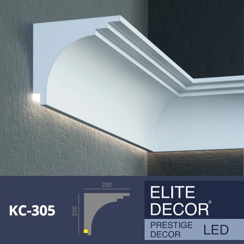 Az EPS díszlécek nagy előnye, hogy könnyen vághatók, festhetők és karbantartásmentesek, így gyorsan, pormentesen szerelhetők. A LED szalagok diszkréten elrejthetők a profil belsejében, így a KC 305 elegáns, indirekt fényforrásként tökéletes választás modern és klasszikus enteriőrökbe egyaránt.