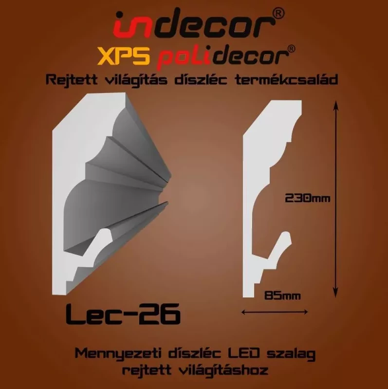 Ez a nagyméretű XPS díszléc ideális választás olyan helyiségekbe, ahol a látványos, modern mennyezeti vagy fali kialakítás fontos szerepet kap. A 23 cm magas profil kifejezetten dekoratív megjelenést biztosít, miközben a rejtett LED világításhoz szükséges hely gyárilag kialakított, így a hangulati fény egyszerűen és tisztán integrálható.